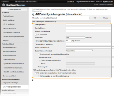 Ha a hálózaton LDAP-kiszolgáló létesítettek, akkor a kiszolgálón is megkeresheti a faxszámokat és e-mail címeket, amelyeket azután megadhat rendeltetési helyként, illetve bejegyezhet a címjegyzékbe. Ha a küldési funkció hitelesítése (LDAP-kiszolgálós hitelesítés) engedélyezve van, akkor be kell jegyeznie a kiszolgálót a hitelesítéshez. A készülékre öt LDAP-kiszolgáló jegyezhető be a kereséshez és a készülék hitelesítéséhez. Az LDAP-kiszolgálókat a Távoli felhasználói felületen keresztül jegyezze be.