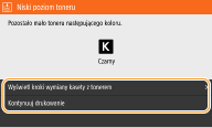 Jeśli komunikat zostaje wyświetlony, gdy urządzenie wykonuje operację odbioru faksu/I-faksu lub skonfigurowano automatyczne drukowanie raportu, odebrane faksy/I-faksy i raporty zostaną zapisane w pamięci urządzenia, aby zachować ich kopię w razie, gdyby ich wydruki wyblakły. Aby kontynuować drukowanie pomimo niskiego poziomu toneru w zasobniku, dla opcji <Kon.dr. Gdy mało ton. w kas.> wybierz ustawienie <Włącz>. <Kon.dr. Gdy mało ton. w kas.>