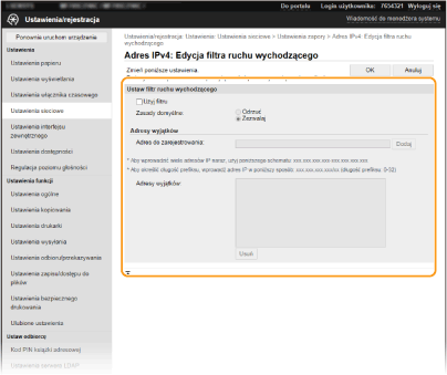 Nieprawidłowo wprowadzone adresy IP mogą uniemożliwić dostęp do urządzenia z poziomu Zdalnego interfejsu użytkownika. Konieczne będzie wtedy ustawienie filtra <Filtr adresów IPv4> albo <Filtr adresów IPv6> na <Wyłącz>.