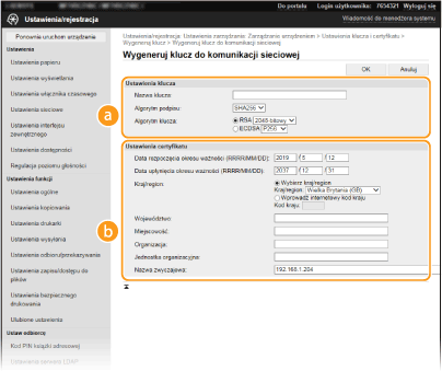 Klucz i certyfikat można wygenerować za pomocą urządzenia, jeśli wymaga tego komunikacja szyfrowana z użyciem protokołu Transport Layer Security (TLS). Z szyfrowania TLS można korzystać podczas udzielania dostępu do urządzenia przez Zdalny interfejs użytkownika. Wraz z kluczem i certyfikatem wygenerowanymi w menu „Komunikacja sieciowa” używane są certyfikaty z podpisem własnym.