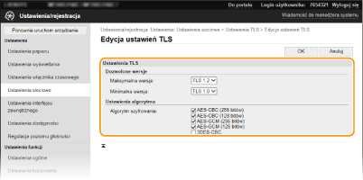 Korzystanie z panelu sterowaniaKomunikację szyfrowaną z użyciem protokołu TLS można również włączyć albo wyłączyć z poziomu <Menu> na ekranie Główny. <Zdalny interfejs użytkownika>