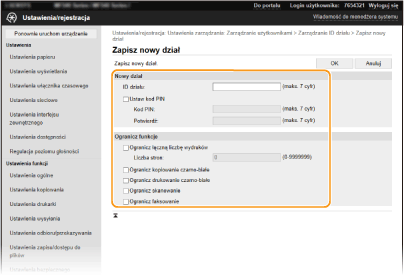 [Ogranicz funkcje] W odniesieniu do zarejestrowanych wydziałów można ograniczyć liczbę stron możliwych do wydrukowania, a także dostępność funkcji. Aby ograniczyć liczbę stron możliwych do wydrukowania, zaznacz pole wyboru obok wybranego typu ograniczenia i wprowadź odpowiednią liczbę stron w polu [Liczba stron]. Zaznacz pola wyboru obok funkcji, do których dostęp ma zostać ograniczony.