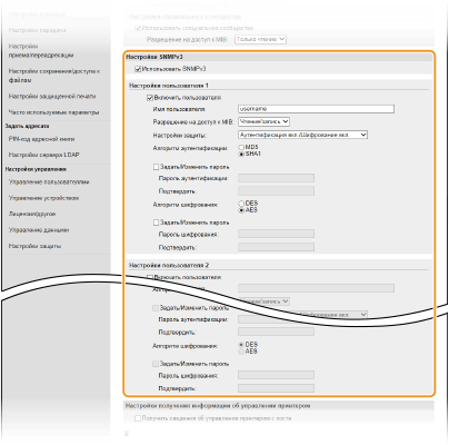 Простой протокол сетевого управления (SNMP) представляет собой протокол для мониторинга и контроля устройств связи в сети с помощью базы данных MIB. Аппарат поддерживает версию протокола SNMPv1 и версию с расширенными функциями безопасности SNMPv3. Статус аппарата можно проверить с помощью компьютера при печати документов или использовать для этого Удаленный ИП. Можно разрешить использование SNMPv1 или SNMPv3 по отдельности или одновременно. Укажите настройки для каждой версии в соответствии с особенностями сетевой среды и конкретными задачами.