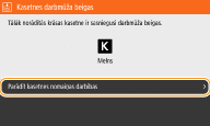 Ja, iekārtai saņemot faksa/I-Fax dokumentu vai iestatot automātisku pārskatu izvadi, tiek parādīts ziņojums, saņemtie faksa/I-Fax dokumenti un pārskati tiks saglabāti atmiņā, lai pēc izdrukāšanas tie nebūtu blāvi. Lai turpinātu drukāšanu, pat ja tonera kasetnē atlicis maz tonera, iestatiet opciju <Turp. dr., ja daudz.kas. zems> pozīcijā <Ieslēgt>. <Turp. dr., ja daudz.kas. zems>