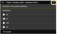 Kai kuriuose ekranuose paspaudę <?> mygtuką galite peržiūrėti funkcijų aprašus arba jų valdymą.