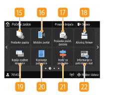 Pritisnite da biste provjerili status ispisivanja, pogledali povijest korištenja te da biste pogledali mrežne postavke, npr. IP adresu uređaja. Možete i provjeriti status uređaja, primjerice veličinu papira i preostalu količinu tonera te je li došlo do pogrešaka. Zaslon <Nadzor statusa>