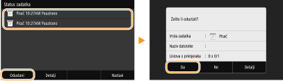 Otkazivanje iz sučelja Remote UI (Korisničko sučelje za daljinski pristup)Ispis možete otkazati na stranici [Job Status] u sučelju Remote UI (Korisničko sučelje za daljinski pristup): Provjera trenutnog statusa dokumenata za ispis