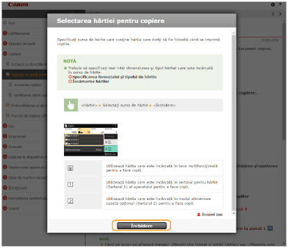Când faceţi clic pe pictogramă, este posibil ca pagina curentă să se întunece şi să apară o fereastră pop-up. Pentru a reveni la pagină, faceţi clic pe [Închidere] în fereastra pop-up.
