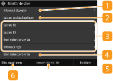 Când apăsaţi <Monitor stare>, apare un ecran în care puteţi verifica progresul documentelor, precum şi starea aparatului şi informaţii despre setările de reţea.