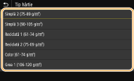 Dacă ecranul afişat mai sus nu este afişat când încărcaţi hârtieDacă încărcaţi mereu aceeaşi hârtie în tava universală, puteţi sări peste setarea pentru hârtie dacă înregistraţi dimensiunea şi tipul hârtiei ca setare implicită. Când setarea implicită este înregistrată, totuşi, ecranul de mai sus nu este afişat. Pentru a afişa ecranul, selectaţi <Specificare la încărcarea hârtiei> (Înregistrarea setărilor implicite de hârtie pentru tava multifuncţională).