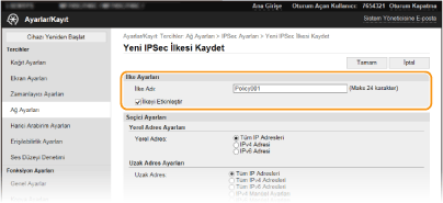 İşletim panelini kullanmaIPSec iletişimini, Ana Ekran'daki <Menü> öğesinden de etkinleştirebilir veya devre dışı bırakabilirsiniz. <IPSec Kullan>