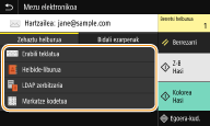 Etxea pantailako <Helbide-liburua> atalean helburu bat hautatzen bada, posta elektronikoa bidaltzeko edo fitxategiak gordetzeko oinarrizko funtzioen pantaila bistara daiteke zehaztutako helburua hautatuta mantentzen delarik.