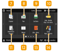 ![]() | <Opciones papel>Este botón se utiliza para especificar el tamaño y el tipo de papel cargado en el casete y en la bandeja multiuso. Especificación del tamaño y tipo de papel <Portal móvil>Utilícelo para establecer una conexión con un dispositivo móvil. Conectar con dispositivos móviles <Opc. de pant. de inicio>Permite cambiar el orden en el que se muestran los botones de la pantalla Inicio. Personalización de la pantalla Inicio <Actualizar firmware>Le permite actualizar el firmware a través de Internet. Actualización del firmware <Copia de carné>Utilice esta función para copiar el anverso y el reverso de un carné de conducir u otro tipo de tarjeta en el mismo lado de una hoja de papel. Realizar copias de carné <Copia de pasaporte>Permite copiar varios pasaportes en una hoja. Realizar copias de pasaporte <Guía de funcionamiento>Pulse para obtener ayuda sobre el funcionamiento y las causas/soluciones del error. |