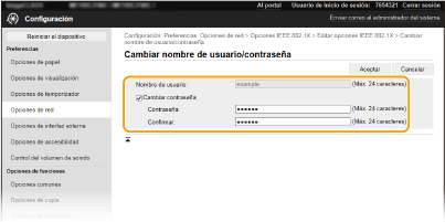 3 | Establezca el nombre de usuario/contraseña. [Nombre de usuario] Introduzca caracteres alfanuméricos en el nombre de usuario. [Cambiar contraseña] Para configurar o cambiar la contraseña, marque la casilla de verificación e introduzca caracteres alfanuméricos para la nueva contraseña en los cuadros de texto [Contraseña] y [Confirmar]. |