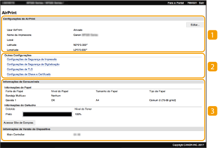 Você pode exibir a tela para AirPrint, na qual pode não só acessar as configurações de AirPrint mas também visualizar informações sobre consumíveis, como papel e cartuchos de toner. Além disso, você pode configurar as definições da função de segurança.