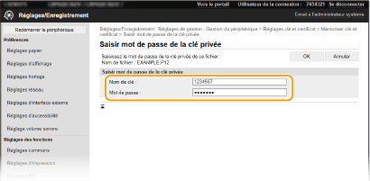 2 | Saisissez le nom de la clé et le mot de passe. [Nom de clé] Saisissez le nom de la clé à enregistrer en caractères alphanumériques. [Mot de passe] Saisissez le mot de passe de la clé privée définie pour le fichier à enregistrer en caractères alphanumériques. |