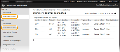 Tous les documents en cours d'impression ou sur le point de l'être figurent dans la liste, quel que soit le réglage choisi pour la gestion des numéros de service. Si vous avez saisi votre nom d'utilisateur en mode Utilisateur général, votre nom d'utilisateur ne s'affiche que sur les documents que vous imprimez. Cliquez sur [Numéro de tâche] pour les documents dont l'impression est suspendue et les documents sécurisés pour afficher leurs informations détaillées. Vous pouvez vérifier le nom de l'utilisateur et le nombre de pages sur le document imprimé. |