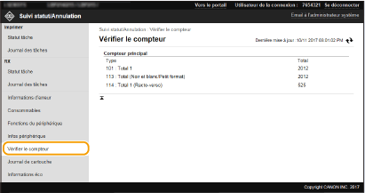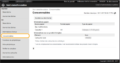Le format et le type de papier de la source ainsi que le numéro de modèle de cartouche de toner, notamment, sont également affichés. Vous pouvez également cliquer sur [Vérifier les détails des consommables], dans la page du portail (page principale) pour afficher cette page (