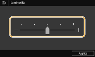 È possibile modificare diverse impostazioni relative alla visualizzazione, come la lingua: <Impostazioni visualizzazione> È possibile cambiare la schermata visualizzata automaticamente quando la macchina non viene utilizzata per uno specificato intervallo di tempo: <Funzione dopo ripristino automatico> È possibile apportare modifiche a varie impostazioni legate all'operatività, come la luminosità dello schermo: <Accessibilità> |