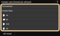 Se non viene visualizzata la schermata precedente quando si carica la cartaSe si carica sempre la stessa carta vassoio multiuso, è possibile ignorare le operazioni di impostazione carta registrando formato e tipo di carta come impostazioni predefinite. Quando si registra l'impostazione predefinita, tuttavia, la schermata illustrata sopra non viene visualizzata. Per visualizzare la schermata, selezionare <Specificare al caricamento carta> (Registrazione delle impostazioni predefinite per la carta per il vassoio multiuso). |
