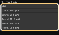 Se si cambia frequentemente il formato della carta da caricare, è possibile selezionare <Libero>: in questo modo si riduce il numero di procedure necessarie a modificare l'impostazione ogni volta. Tuttavia, occorre tenere presente che questa impostazione permette alla macchina di stampare anche in caso di mancata corrispondenza tra il tipo di carta specificato nel driver della stampante e la carta effettivamente caricata nella macchina.