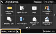 Quando viene visualizzato un messaggio Quando si stampa, è possibile continuare a stampare l'originale. Se viene visualizzato un messaggio mentre si riceve un I-Fax, la macchina non stampa, in modo da non produrre stampe poco chiare. Per continuare a stampare anche se la quantità di toner nelle cartucce si sta esaurendo, impostare <Cont. stp. se liv. cart. bas.>/<Continua stampa se livello cart. è basso> su <On>. <Cont. stp. se liv. cart. bas.>/<Continua stampa se livello cart. è basso>Specificare quando deve essere visualizzato il messaggio |