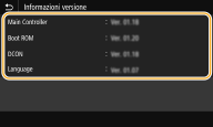 Verifica della versione del firmwareÈ possibile controllare la versione del firmware dal pannello operativo della macchina. Completata l'operazione di aggiornamento del firmware, verificare che l'aggiornamento sia stato eseguito correttamente. Verifica della versione del firmware |