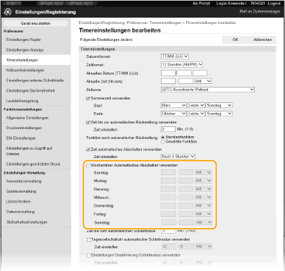 Aktivieren Sie das Kontrollkästchen [Wochentimer Automatisches Abschalten verwenden], und stellen Sie die Zeit zum Ausschalten der Stromversorgung ein.