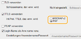 1 | Aktivieren Sie das Kontrollkästchen [TTLS verwenden] oder [PEAP verwenden]. Internes Protokoll für TTLS Sie können MSCHAPv2 oder PAP auswählen. |