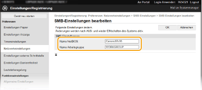 | | SMB (Server Message Block) (SMB) ist ein Protokoll für die Freigabe von Ressourcen wie Dateien und Drucker unter mehreren Geräten in einem Netzwerk. Sie müssen es verwenden, um das Gerät als einen freigegebenen Drucker in einem SMB-Netzwerk konfigurieren zu können. Je nach Netzwerk müssen Sie eventuell den NetBIOS- und den Workgroup-Namen einstellen. |