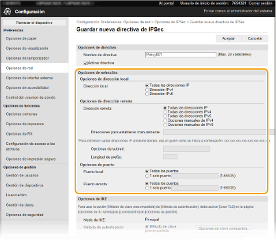 Si se selecciona [Opciones manuales de IPv4] o [Opciones manuales de IPv6] en [Dirección remota], introduzca la dirección IP para aplicar la directiva. También puede introducir un rango de direcciones insertando un guión entre las direcciones.