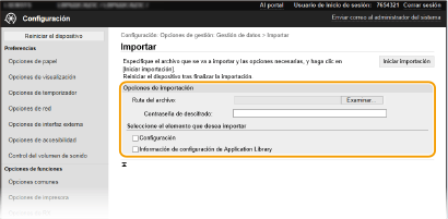 Cargue (importe) los datos exportados desde el equipo. También puede importar opciones del equipo desde otro equipo al suyo si son del mismo modelo.