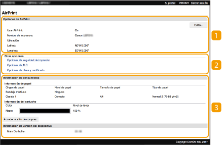 Puede visualizar la pantalla para AirPrint, en la que, además de acceder a las opciones de AirPrint, puede ver la información sobre los consumibles, como el papel y el cartucho de tóner. Además, puede configurar las opciones de las funciones de seguridad.