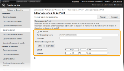 Puede registrar la información, incluido el nombre del equipo y la ubicación de instalación, que se utilice para identificar el equipo. Asimismo, puede deshabilitar la función AirPrint del equipo. Utilice la IU remota para cambiar estas opciones.