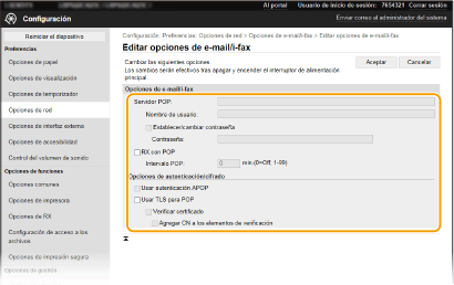 Seleccione la casilla de verificación para cifrar la comunicación con el servidor POP3 mediante TLS. Seleccione la casilla de verificación de [Verificar certificado] o [Agregar CN a los elementos de verificación] en función de sus necesidades.