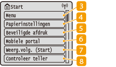 ![]() | <Menu><Functie-instellingen>, <Voorkeuren>, en vele andere instellingen van het apparaat zijn toegankelijk met deze knop. Overzicht van menuopties <Papierinstellingen>Met deze knop kunt u het formaat en type papier opgeven dat is geladen in de papierlade en multifunctionele invoer. Het type en formaat papier opgeven <Beveiligde afdruk>Met behulp van deze functie drukt u een beveiligd document af. Een document afdrukken dat is beveiligd met een pincode (beveiligd afdrukken) <Mobiele portal>Breng hiermee een verbinding met een mobiel toestel tot stand. Verbinding maken met mobiele apparaten <Weerg.volg. (Start)>Hiermee kunt u de knoppen op het scherm Start in een andere volgorde weergeven. Het scherm Start aanpassen <Controleer teller>Geeft het totaale afdrukvolume weer. Aantal afdrukken weergeven |