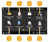 ![]() | <Geheugenmedia afdruk>Druk bestanden af die op een USB-geheugenapparaat zijn opgeslagen. Afdrukken vanaf een USB-geheugenapparaat (afdrukken via geheugenmedia) <Beveiligde afdruk>Met behulp van deze functie drukt u een beveiligd document af. Een document afdrukken dat is beveiligd met een pincode (beveiligd afdrukken) <Menu><Functie-instellingen>, <Voorkeuren>, en vele andere instellingen van het apparaat zijn toegankelijk met deze knop. Overzicht van menuopties <Appl. Library -Handleiding>Geeft een beschrijving van Application Library (Toepassingenbibliotheek). <Papierinstell.>Met deze knop kunt u het formaat en type papier opgeven dat is geladen in de papierlade en multifunctionele invoer. Het type en formaat papier opgeven <Mobiele portal>Breng hiermee een verbinding met een mobiel toestel tot stand. Verbinding maken met mobiele apparaten <Instellingen startscherm>Hiermee kunt u de knoppen op het scherm Start in een andere volgorde weergeven. Het scherm Start aanpassen <Update firmware>Hiermee kunt u de firmware actualiseren via het internet. De Firmware updaten |