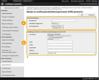 Op het apparaat gegenereerde certificaten hebben geen CA-handtekening, een communicatiefout kan het gevolg zijn, afhankelijk van de apparaten waarmee het communiceert. Voordat de certificeringsinstantie het certificaat met CA-handtekening kan afgeven, moet u CSR-gegevens (Certificate Signing Request) verkrijgen die de beheerder van de UI op afstand kan genereren. Als het certificaat is verstrekt, registreer het dan in de sleutel met de gegenereerde CSR.