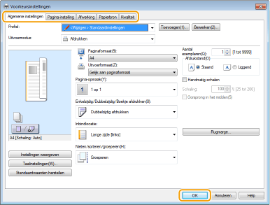 Selecteer het printerstuurprogramma voor dit apparaat en klik op [Voorkeursinstellingen] of [Eigenschappen].