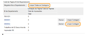 Se pretender repor as contagens a zero, clique na ligação de texto correspondente abaixo de [ID de Departamento] e clique em [Limpar Contagem]  [OK]. Se quiser repor a zeros as contagens de todas as IDs de departamento, clique em [Limpar Todas as Contagens]  [OK].