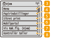 ![]() | <Menu><Funktionsindstillinger>, <Præferencer> og mange andre maskinindstillinger starter med denne knap. Liste over menuen Indstilling <Papirindstillinger>Denne knap bruges til at angive størrelsen og typen af papir, der er lagt i papirskuffen og universalbakken. Angivelse af papirformat og –type <Sikret print>Brug denne funktion til at udskrive et sikkert dokument. Udskrive et dokument, der er sikret med en PIN-kode (sikret print) <Mobilportal>Brug denne til at etablere en forbindelse til en mobil enhed. Tilslutning til mobile enheder <Vis Ræk.flg. (Hjem)>Gør det muligt at ændre den rækkefølge, som Hjem-skærmknapperne vises i. Tilpasning af Hjem-skærmen <Kontrollér tæller>Viser den samlede mængde udskrifter. Visning af tællerværdien |