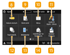![]() | <Hukom.med.prt.>Udskriver filer gemt på en USB-hukommelsesenhed. Udskrivning fra USB-hukommelse (Hukommelsesmedieprint) <Sikret print>Brug denne funktion til at udskrive et sikkert dokument. Udskrive et dokument, der er sikret med en PIN-kode (sikret print) <Menu><Funktionsindstillinger>, <Præferencer> og mange andre maskinindstillinger starter med denne knap. Liste over menuen Indstilling <Guide til Applic. Library>Viser en beskrivelse af Application Library (Programbibliotek). <Papirindstilli.>Denne knap bruges til at angive størrelsen og typen af papir, der er lagt i papirskuffen og universalbakken. Angivelse af papirformat og –type <Mobilportal>Brug denne til at etablere en forbindelse til en mobil enhed. Tilslutning til mobile enheder <Indstillinger for Startskærm>Gør det muligt at ændre den rækkefølge, som Hjem-skærmknapperne vises i. Tilpasning af Hjem-skærmen <Opdater firmware>Gør det muligt at opdatere firmwaren via internettet. Opdatering af firmware |