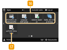 ![]() | Knappen Application Library (Programbibliotek)Du kan bruge disse knapper til at udføre praktiske funktioner ved hjælp af hurtigopkald. For mere information henvises til manualen for Application Library (Programbibliotek) på hjemmesiden med online-manualer. <uniFLOW Online Setup>Du kan kontrollere enhedens og brugerens brugsstatus ved at etablere forbindelse til cloud-tjenesten. For mere information henvises til Canons websted. |