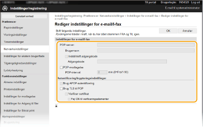 Markér afkrydsningsfeltet for at kryptere kommunikation med POP3-serveren ved hjælp af TLS. Markér afkrydsningsfeltet [Verificer certifikat] eller [Føj CN til verificeringselementer] afhængigt af dine behov.