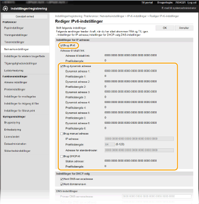 Link-Lokal-adresse | En adresse, der kun er gyldig inden for et undernet eller link, og som ikke kan bruges til at kommunikere med enheder uden for en router. En lokal linkadresse indstilles automatisk, når IPv6-funktionen i maskinen aktiveres. |