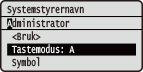 Enkelte taster på USB-tastaturet, som [Backspace], [Home] og [End], kan ikke brukes. Når taster som ikke kan brukes, trykkes, blir ingenting tastet inn eller endret. Trykk på [Delete]-tasten for å slette tekst. Ved å trykke på [RETURN/ENTER]-tasten fullføres tekstinntasting på samme måte som å velge <Bruk>. Du kan spesifisere oppsettet for tastaturet (amerikansk eller britisk). <Engelsk tastaturoppsett> Du kan når som helst koble USB-tastaturet fra maskinen. Du trenger ikke å gjøre noe som helst før du kobler det fra. Avhengig av visningsspråket, er det ikke sikkert du kan skrive inn enkelte tegn korrekt. Det er mulig at USB-tastaturet ikke virker som de skal, avhengig av typen. |