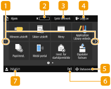 på betjeningspanelet. Bruk dette skjermbildet til å angi innstillinger for funksjoner og registrere funksjoner.![]() | Endre sideBruk denne til å vise en annen side på Hjem-skjermen. Du kan også sveipe til siden hvis du vil bytte side. Mengde toner igjen i tonerkassetteneViser mengden toner igjen i tonerkassettene, i trinn. <Sjekk telleverk>Viser totalvolumet for utskrifter. Vise tellerverdien <Logg av>Bruk denne knappen til å logge ut fra maskinen. <Statusoverv.>Trykk for å sjekke utskriftsstatus, vise brukshistorikk eller nettverksinnstillinger, som IP-adressen til maskinen. Du kan også sjekke maskinens status, som hvor mye papir som er igjen, hvor mye toner som er igjen eller om det har oppstått en feil. <Statusovervåking>-Skjerm Wi-Fi-ikonViser når maskinen er koblet til et trådløst LAN. Brukernavn/IDNavnet eller ID-en til den påloggede brukeren vises. |