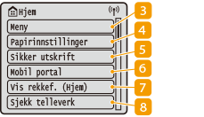 ![]() | <Meny><Funksjonsinnstillinger>, <Preferanser> og mange andre maskininnstillinger har utgangspunkt fra denne knappen. Innstillingsmenyliste <Papirinnstillinger>Denne knappen brukes til å angi format og type for papiret som er lagt inn i papirskuffen og flerfunksjonsskuffen. Spesifisere papirformat og -type <Sikker utskrift>Bruk denne funksjonen til å skrive ut et sikret dokument. Skrive ut et dokument som er sikret med en PIN-kode (konfidensiell utskrift) <Mobil portal>Bruk dette for å opprette en direkte trådløs tilkobling til en mobilenhet. Koble til med mobile enheter <Vis rekkef. (Hjem)>Lar deg endre rekkefølgen som knappene på Hjem-skjermen vises i. Tilpasse Hjem-skjermen <Sjekk telleverk>Viser totalvolumet for utskrifter. Vise tellerverdien |
