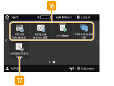 ![]() | Knapp for Application Library (Applikasjonsbibliotek)Du kan bruke disse knappene til å enkelt utføre en funksjon med ett trykk. Se bruksanvisningen for Application Library (Applikasjonsbibliotek) som finnes på nettstedet for bruksanvisninger. <uniFLOW Online Setup>Du kan kontrollere bruksstatusen for enheten og brukeren, ved å koble deg opp mot skyen. Mer informasjon finner du på Canons nettsted. |