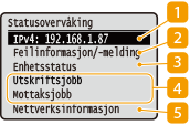 Du kan angi om IP-adressen skal vises på <Statusovervåking>-skjermen ved å stille inn <Vis IP-adresse>.